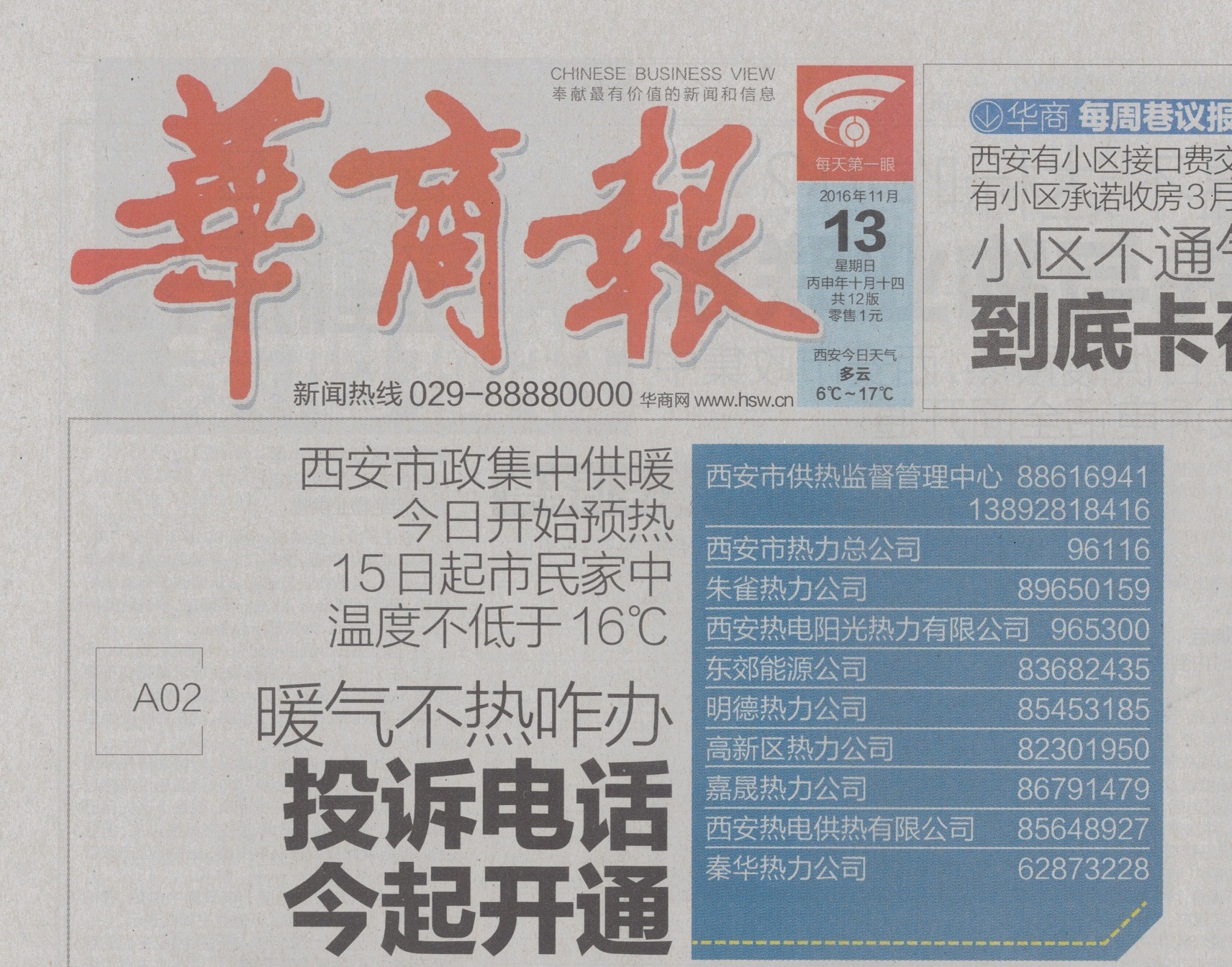 西安市政府通過媒體正式對社會公布我公司市政集中供熱服務電話:029-62873228