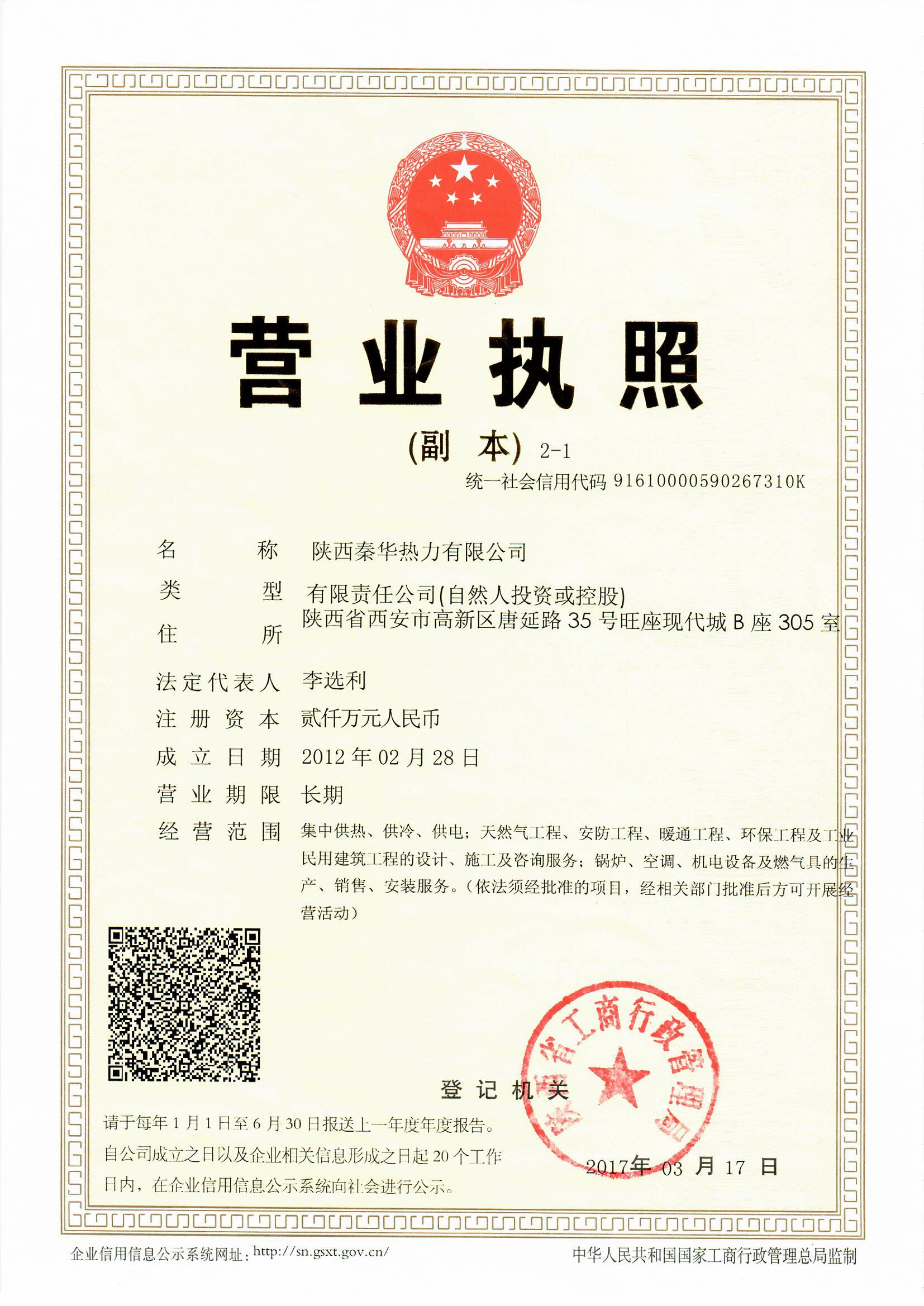 西安市政府頒發《西安市供熱經營許可證》